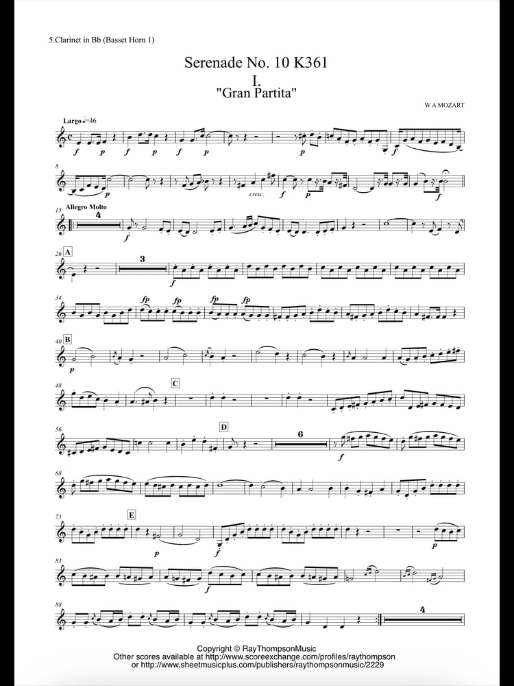 This is a wind quintet (fl,ob,cl,hn,bsn) arrangement of W A Mozart’s Divertimento no 14 in Bb which was originally written as a sextet.(2 oboes,2 horns and 2 bassoons)